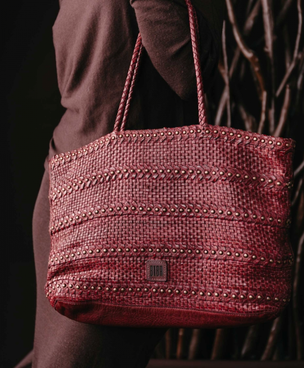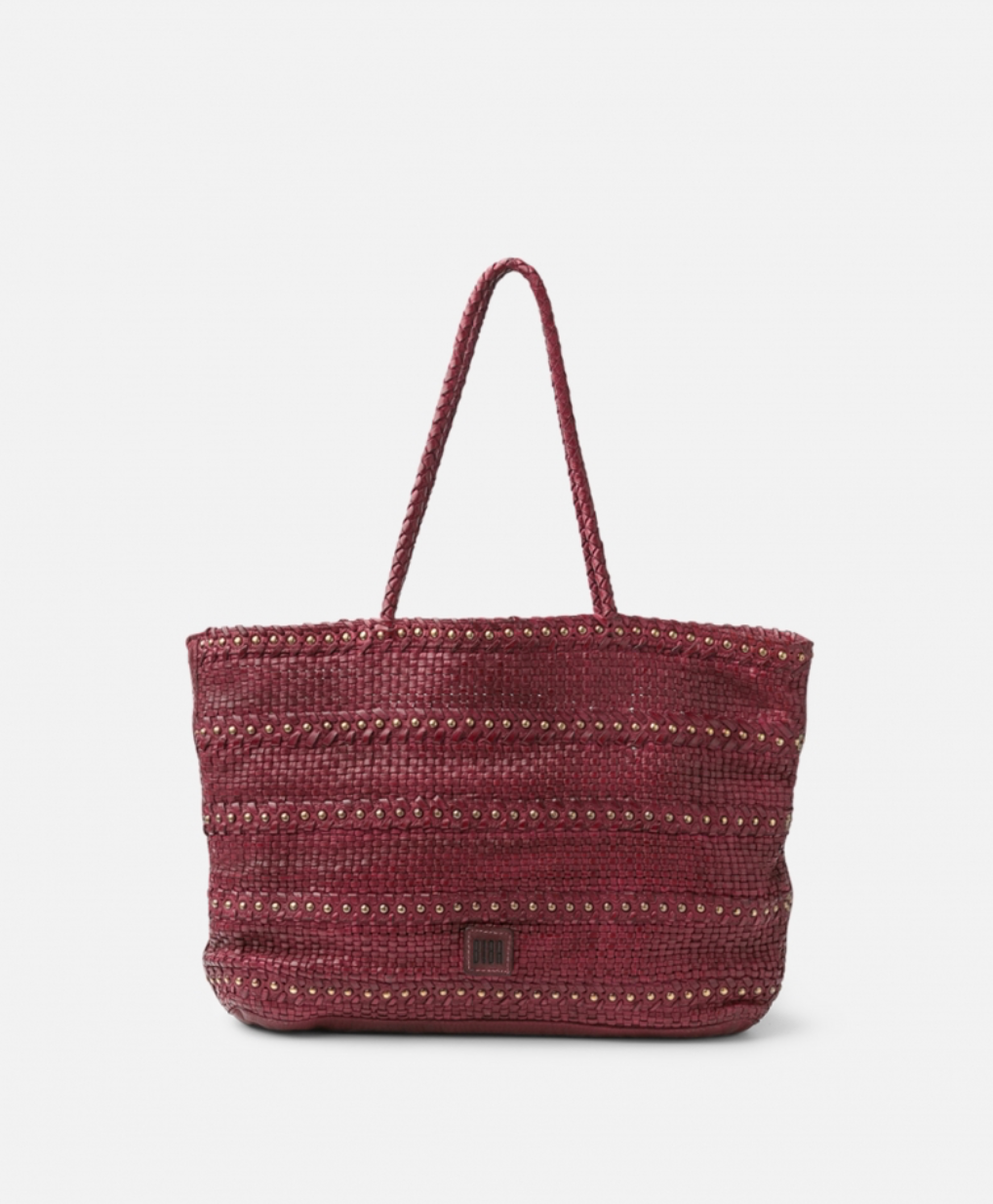 Borsa shopping in pelle intrecciata con borchie decorative, senza fodera e senza chiusure con una piccola tasca interna.